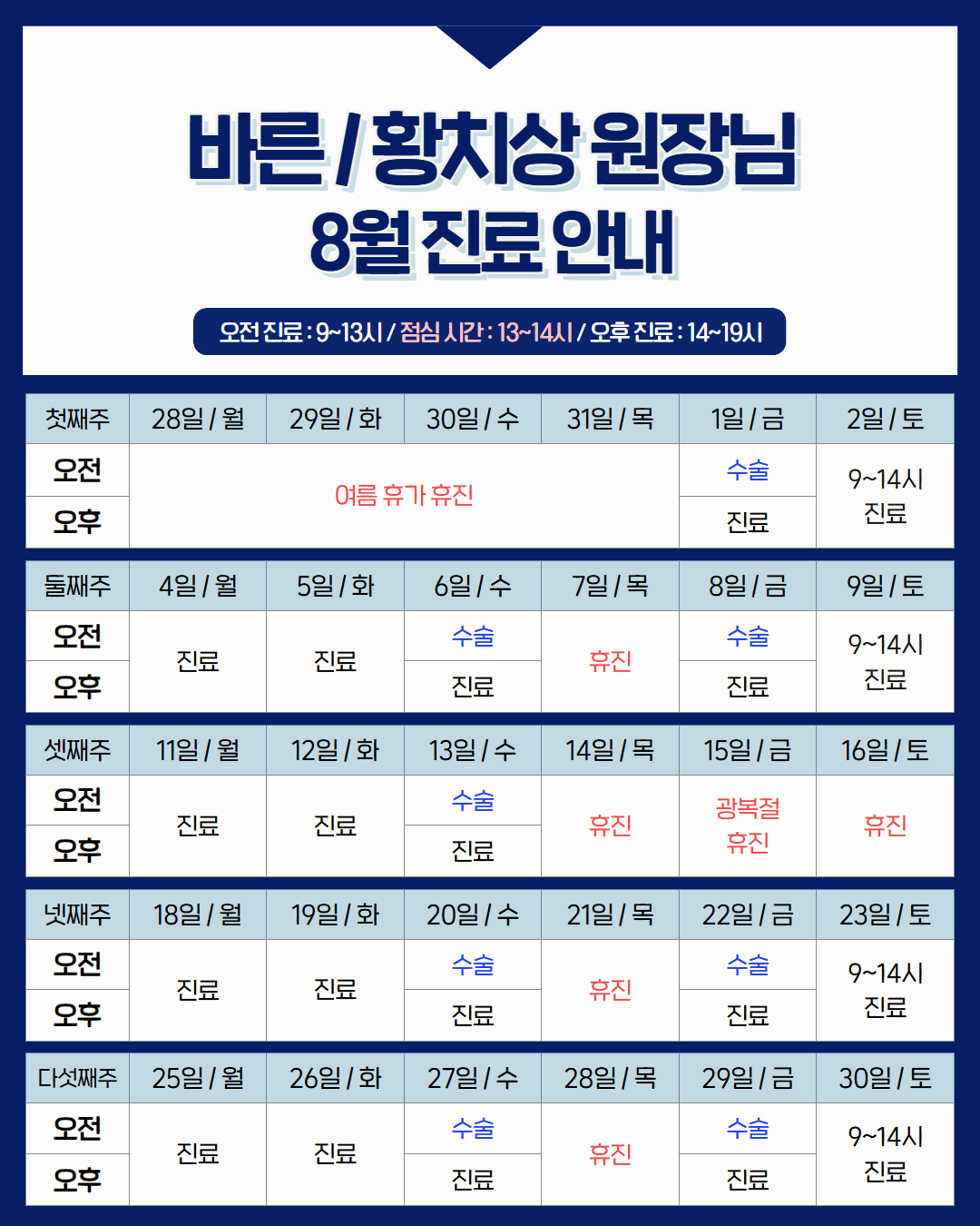 더운 여름, 언제나 건강에 유의하시길 바라며, 다가오는 8월 진료 일정을 안내드립니다.