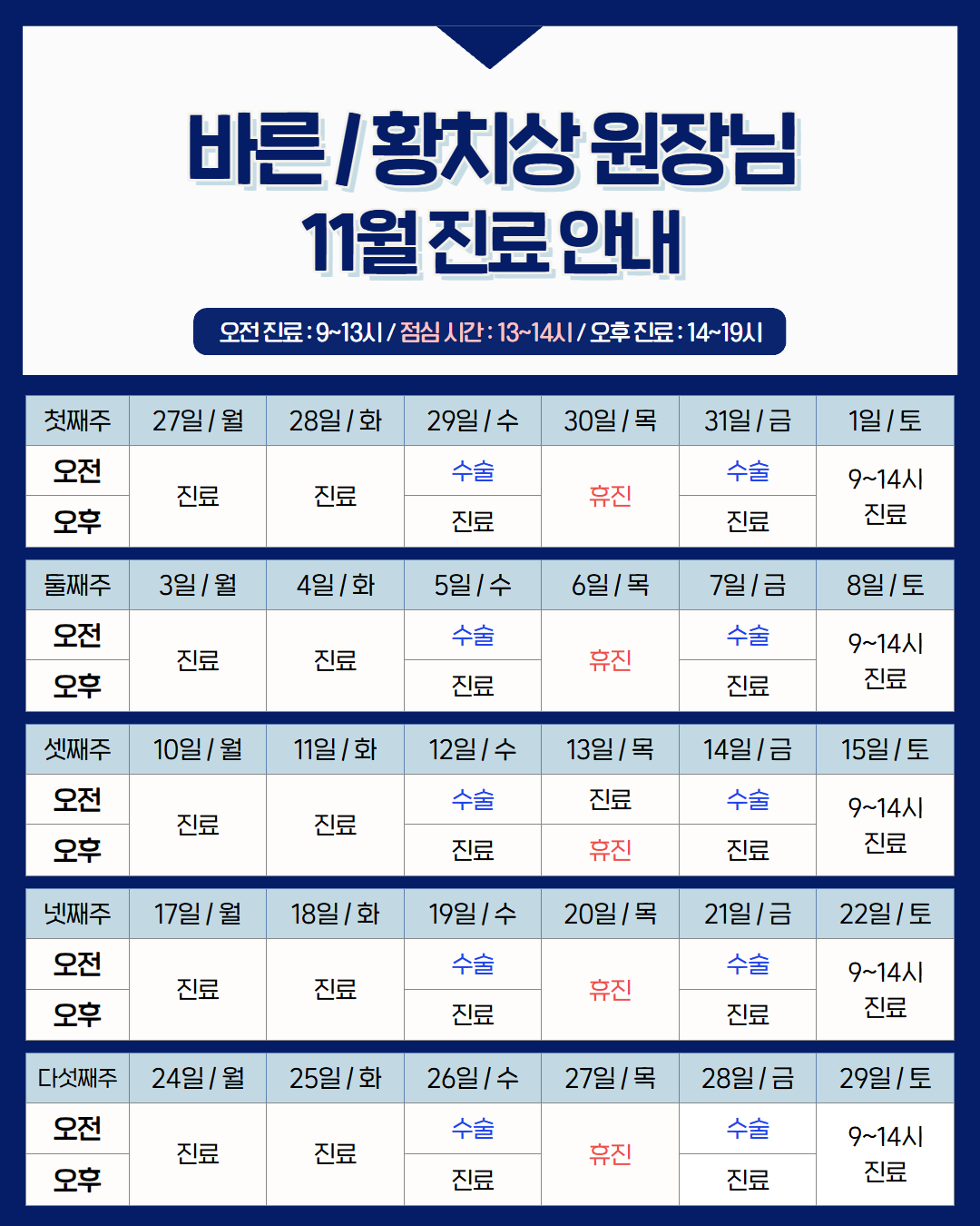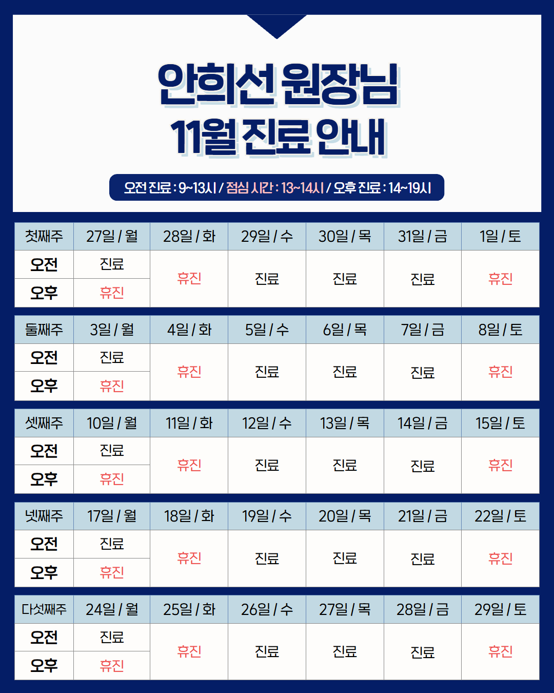 보다 편안하고 원활한 진료 이용을 위해 연세솔이비인후과의 11월 진료 일정을 안내드립니다.